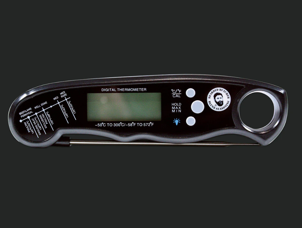 The Bearded Butchers Instant Read Meat Thermometer is a must-have tool for any home cook or grill master. With its instant temperature readings, you can ensure that your meat is cooked to perfection every time. This thermometer is not only accurate and reliable, but it's also incredibly easy to use. Simply insert the probe into the thickest part of the meat and within seconds, you'll have an accurate temperature reading. Whether you're grilling steaks, roasting a chicken, or smoking a brisket, this thermometer will be your secret weapon for achieving perfectly cooked meat. Don't settle for guesswork when it comes to cooking meat. Get the Bearded Butchers Instant Read Meat Thermometer and take your culinary skills to the next level!